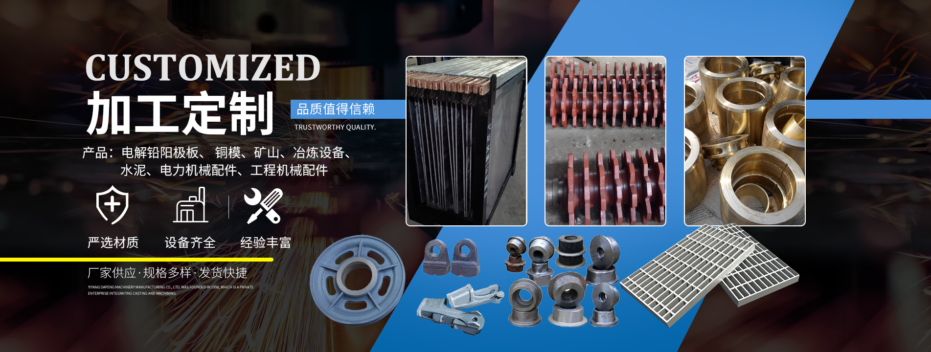 主要產(chǎn)品有:電解鉛陽極板、 銅模、礦山、冶煉設(shè)備、水泥、電力機械配件、工程機械配件