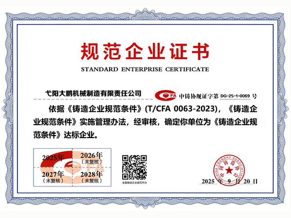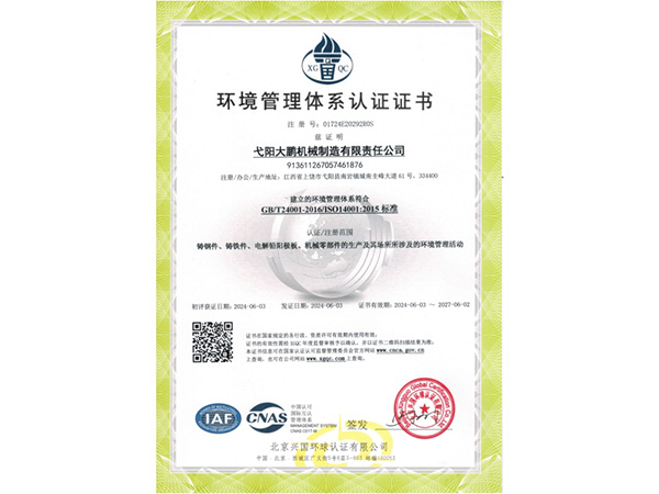 公司順利通過質(zhì)量管理體系認證、環(huán)境體系認證、職業(yè)健康安全管理體系認證、環(huán)評。2015年5月獲國家工信委頒發(fā)的《鑄造企業(yè)準入條件》;2019年做了安全現(xiàn)狀評價;2020年取得了排污許可證。